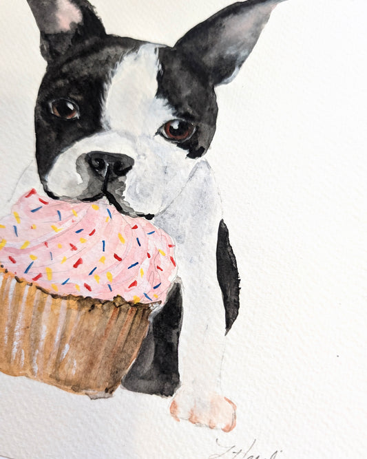 Original 8x8 Boston Terrier & Cupcake Watercolor Artwork